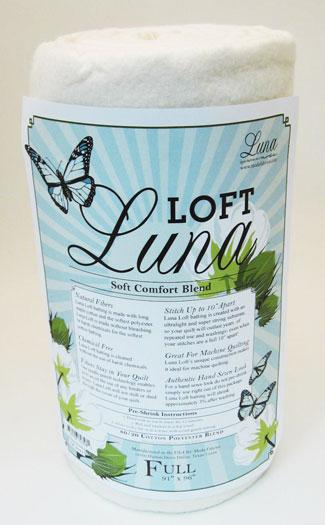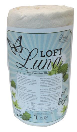 Luna Loft is made with long staple cotton and the softest polyester to create a soft comfort blend. The fibers are cleaned without the use of harsh chemicals. Needle-punched to a thin scrim without the use of binders or resins. Will not shift or shed. Stitch up to 10" apart. Moda Fabrics Exclusive.